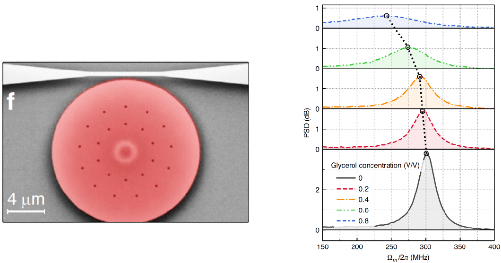 (Gauche) Vue de dessus d’un disque en silicium suspendu, adjacent à un guide d’onde optique. (Droite) Densité spectrale de puissance mesurée autour du premier mode de respiration radial du disque immergé dans un mélange eau/glycérol de concentration variable.